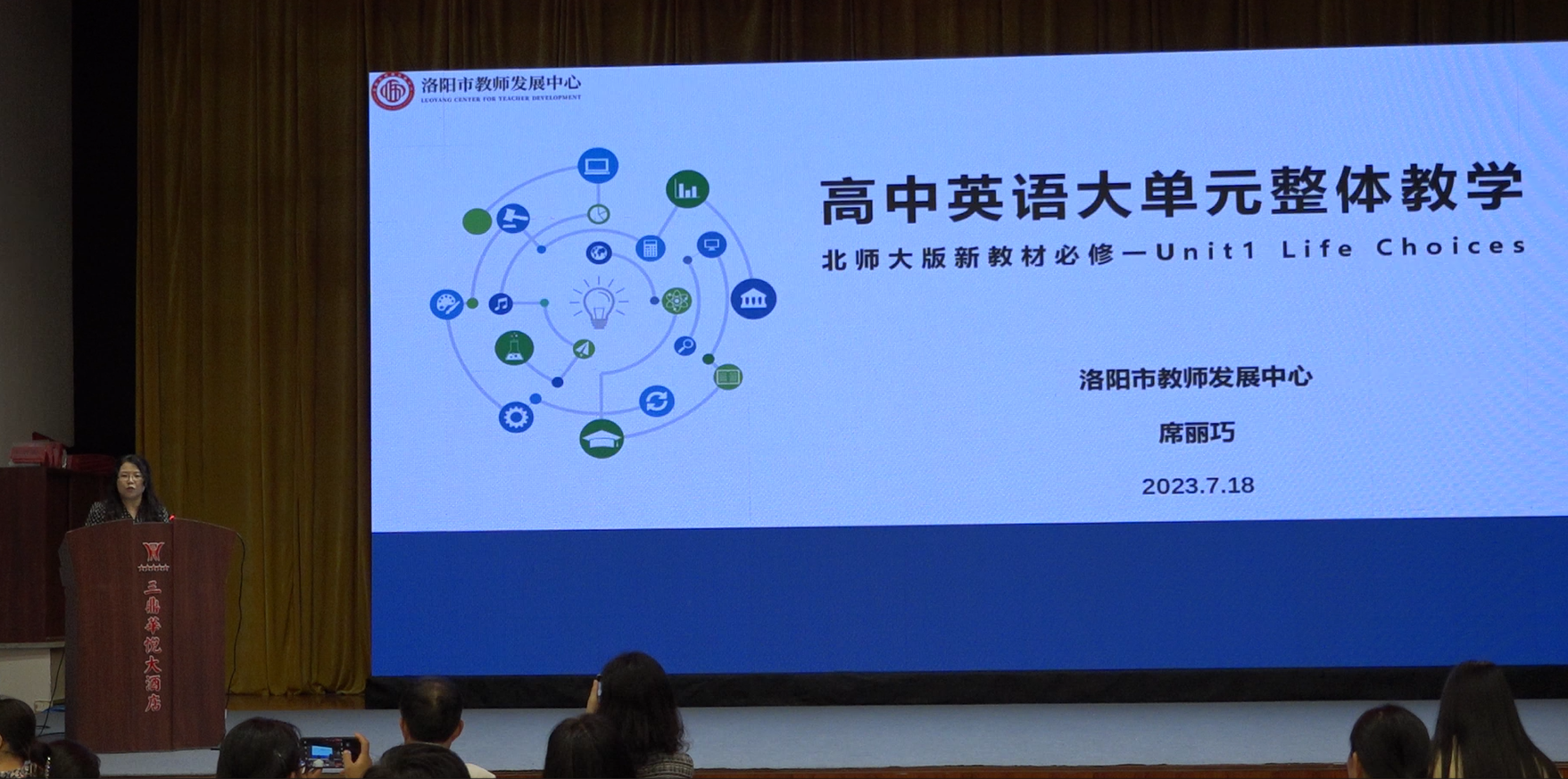 洛阳市教师发展中心高中英语教研员席丽巧老师首先结合北师大版高中英语教材必修第一册Unit 1进行单元整体教学案例分析,从单元整体教学的指导思想、内涵和意义以及实践等方面深入解读单元整体教学理念,并给老师们在教学实践中实施单元整体教学提供了详实的案例参考。