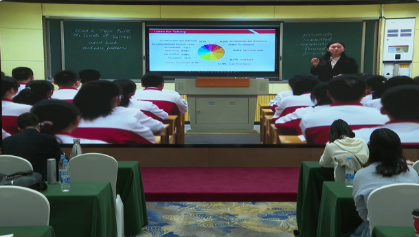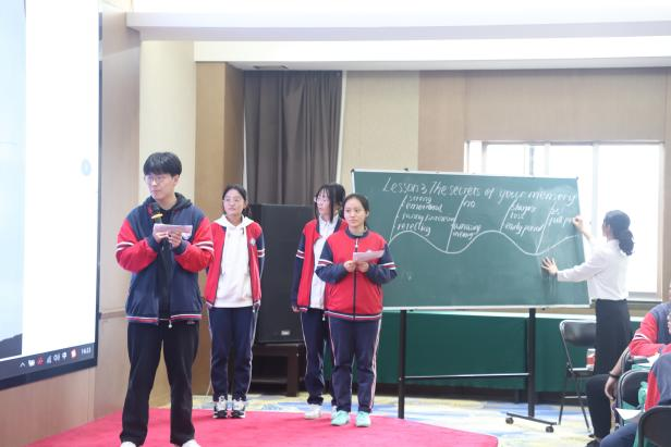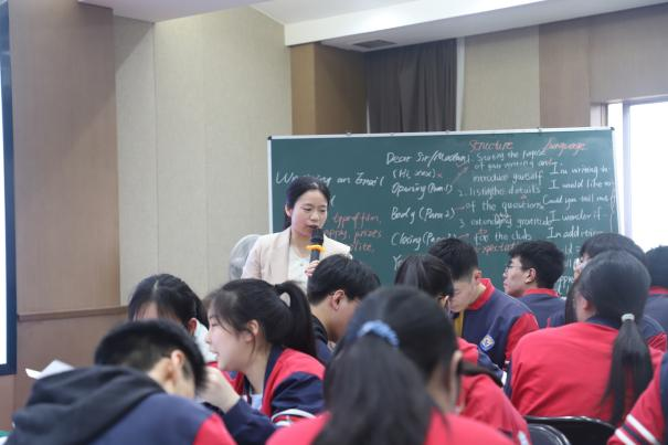 紧接着商丘的许宁老师和信阳的伍秋玲老师分别围绕必修三Unit 9 Lesson 3和Unit 7 Writing Workshop进行了现场示范课,配课的仍然是来自郑州市十一中为民中学的同学们。