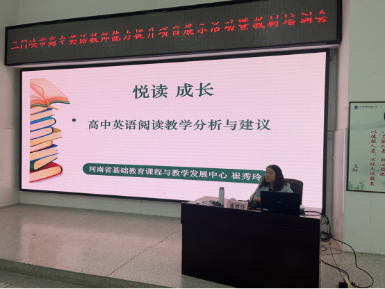 河南省基础教育课程与教学发展中心中学教研部主任、英语教研员崔秀玲对两节课例进行了专业点评,并结合实例作了《高中英语阅读教学分析与建议》的专题报告。