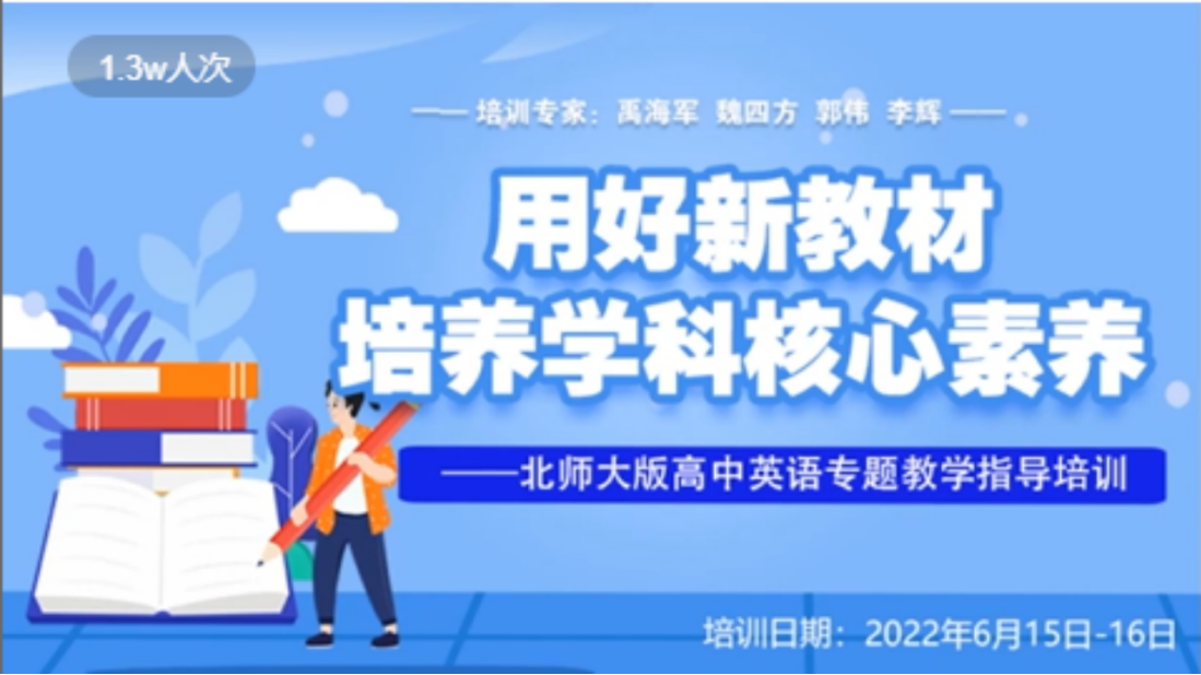 为使我省高中英语教师在日常教学活动中落实“立德树人”根本任务、培养学生英语学科核心素养,象虹英语教学研究团队特邀请具有多年教学经验的一线教师和对新教材、新课程、新高考有深入研究的英语教学专家给广大高中英语学科教师提供切实可行的教学支持与帮助,于2022年6月15日、16日两天召开了“‘用好新教材,培养学科核心素养’——北师大版高中英语新教材专题教学指导培训”会议,累计观看达1.3万人次。