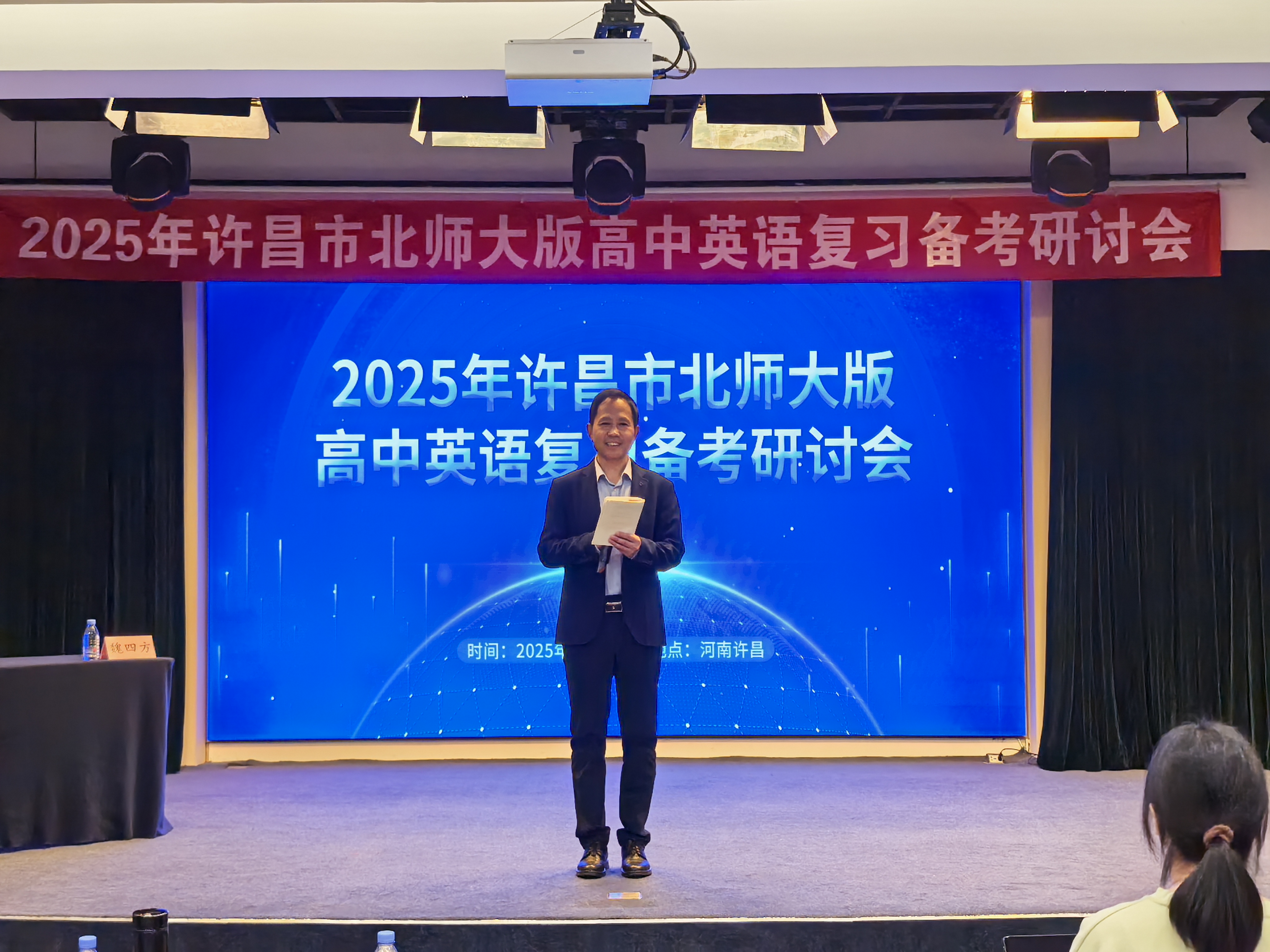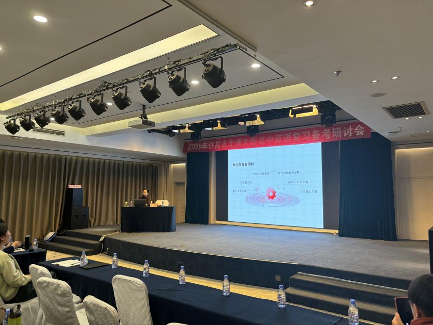 2025年3月26日上午,北京师范大学出版社在许昌瑞贝卡大酒店16楼会议室举办“北师大版高中英语复习备考研讨会”。本次会议旨在助力全市高三英语教师精准把握高考复习方向,提升备考效率。来自许昌市各高中的约150名高三英语教师参会,会议特邀合肥一中英语学科专家张莉老师作专题讲座,许昌市教育科学研究院高中英语教研员魏四方老师全程主持。