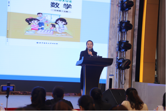 当日下午的研讨聚焦教材具体革新。北师大版教材编委、朝阳区小学数学教研员明雨老师首先系统解读了二年级新教材的整体架构,并针对“图形与几何”、“综合与实践”两大领域的核心变化及落地策略进行了细致剖析。紧接着,中原名师、河南省中小学教育教学专家潘红艳老师立足“数与代数”领域,条分缕析了新教材在此部分的关键调整与教学应对之道。