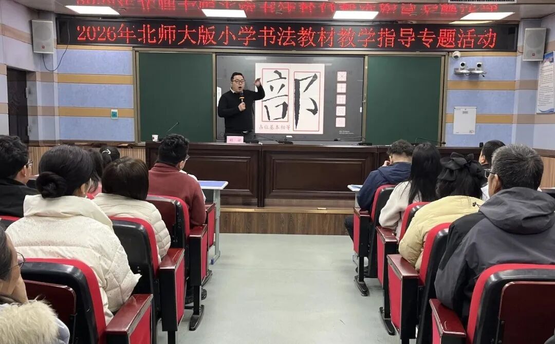 为深入贯彻落实教育部《中小学书法教育指导纲要》要求,全面规范义务教育阶段书法课堂教学,3月16日,2026年北师大版小学书法教材教学指导专题活动在市实验学校成功举办。北京师范大学出版集团河南基础教育教材培训宣传中心培训专家刘亚到场指导培训。全市小学业务副校长、书法骨干教师100余人参加活动。活动由局党组成员、副局长焦建鹏主持。