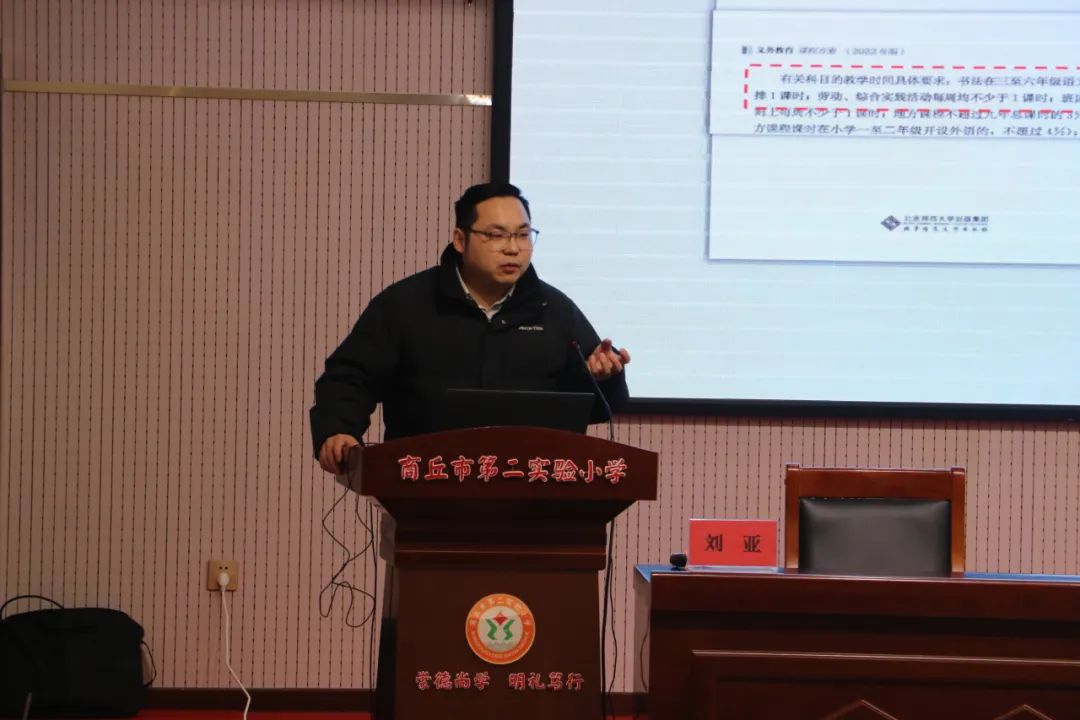 12月25日,由商丘市基础教育发展中心和北京师范大学出版集团主办、河南省中小学书法教育网和商丘市第二实验小学承办的“商丘市2024年北师大版小学书法教材培训会”在商丘市第二实验小学举行。首都师范大学文学博士、副教授、硕士生导师姜栋,北师大出版社河南基础教育教材培训宣传中心总编辑戴晓权,河南省中小学书法教育网总编辑刘亚,商丘市基础教育发展中心书记古永奇,商丘市第二实验小学副校长赵振及全市200余名中小学书法教师、青年骨干教师参加此次培训会,活动由商丘市基础教育发展中心副主任、书法教研员王劲勋主持。