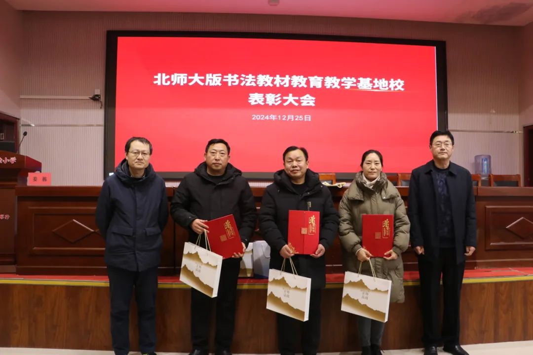 25日下午参会领导为在2024年泉州举办的书法教材年会上北师大版书法教材教育教学基地校获奖学校(商丘市第一实验校和商丘市第二实验小学)和书法大赛获奖教师(商丘市第一实验小学王伟老师、刘红梅老师和商丘市第二实验小学赵振老师)进行颁奖并合影留念。